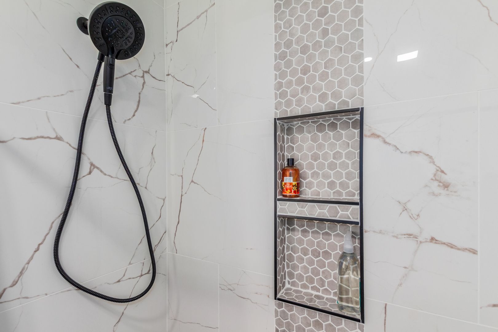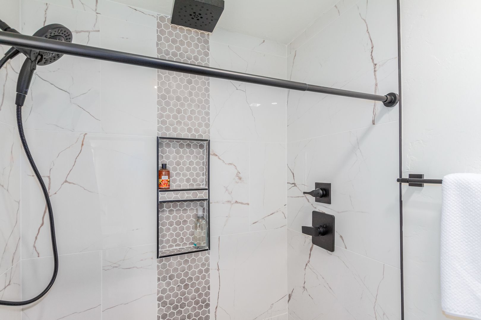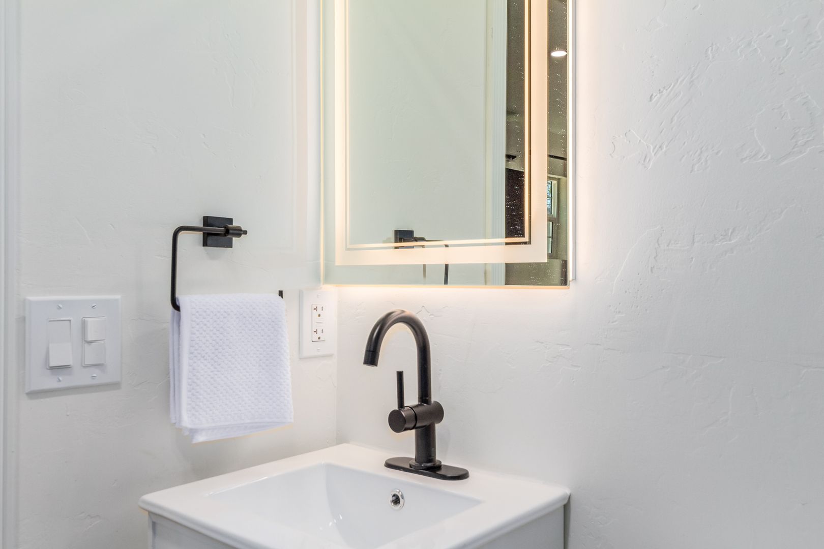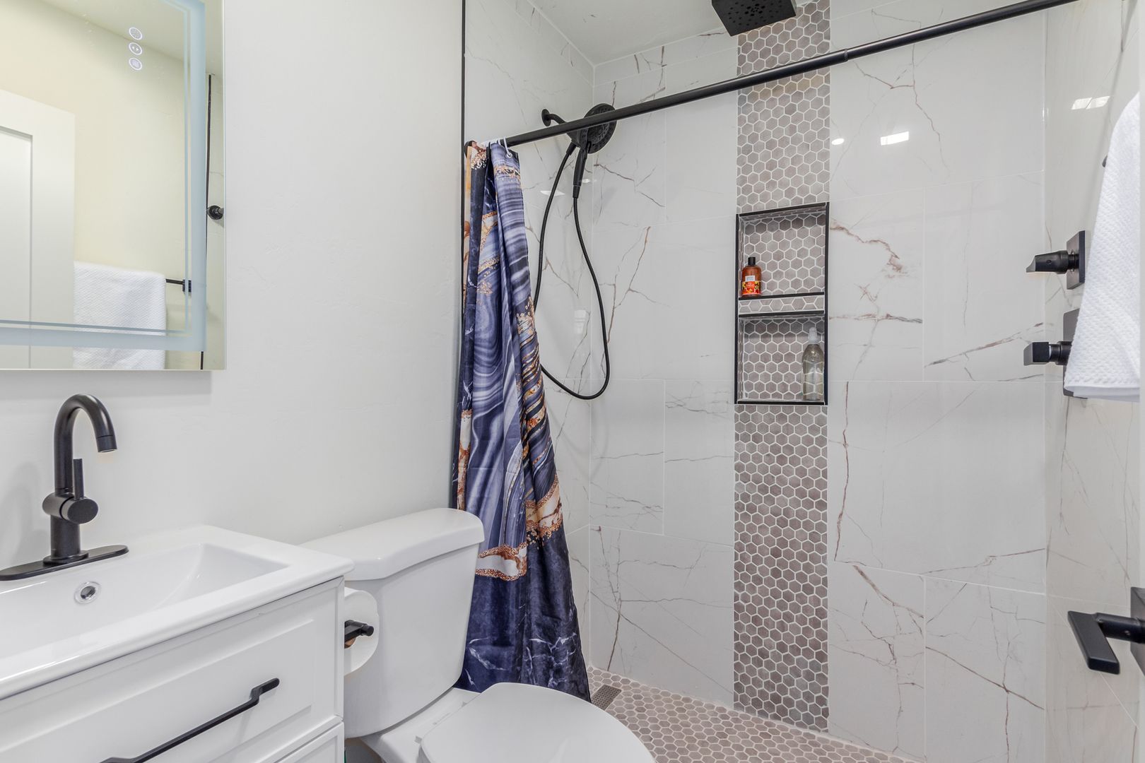 The modern and sleek bathroom features a walk-in shower and is stocked with fresh towels and essential toiletries to make your stay more convenient.