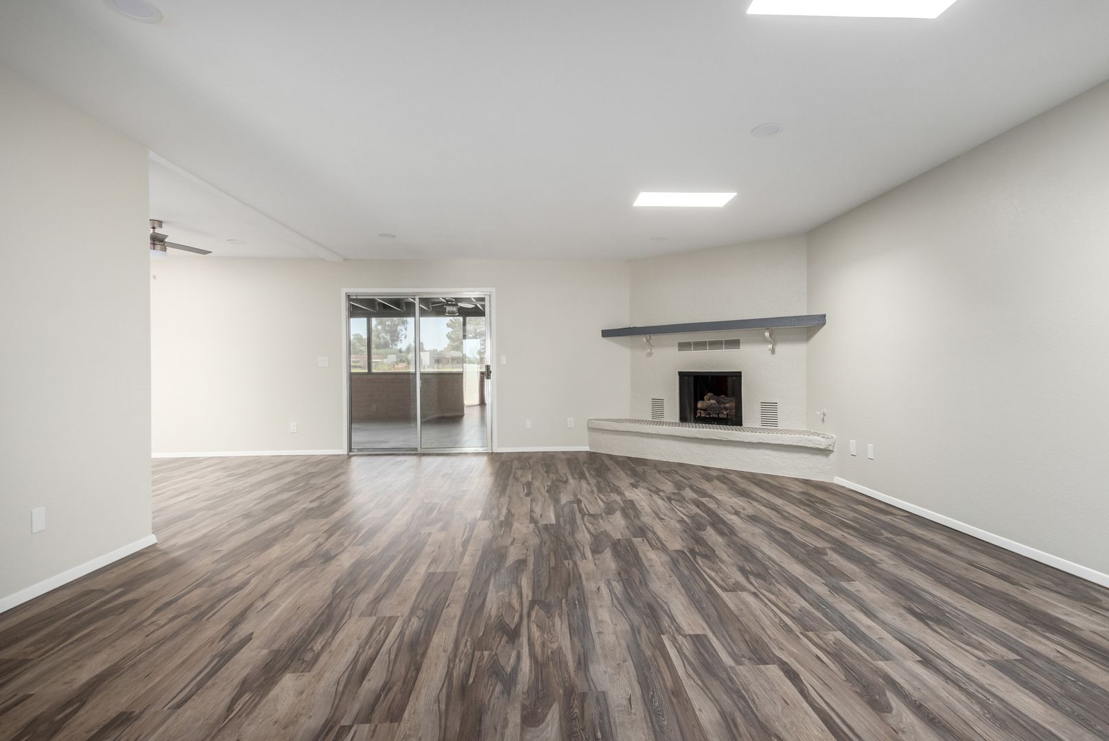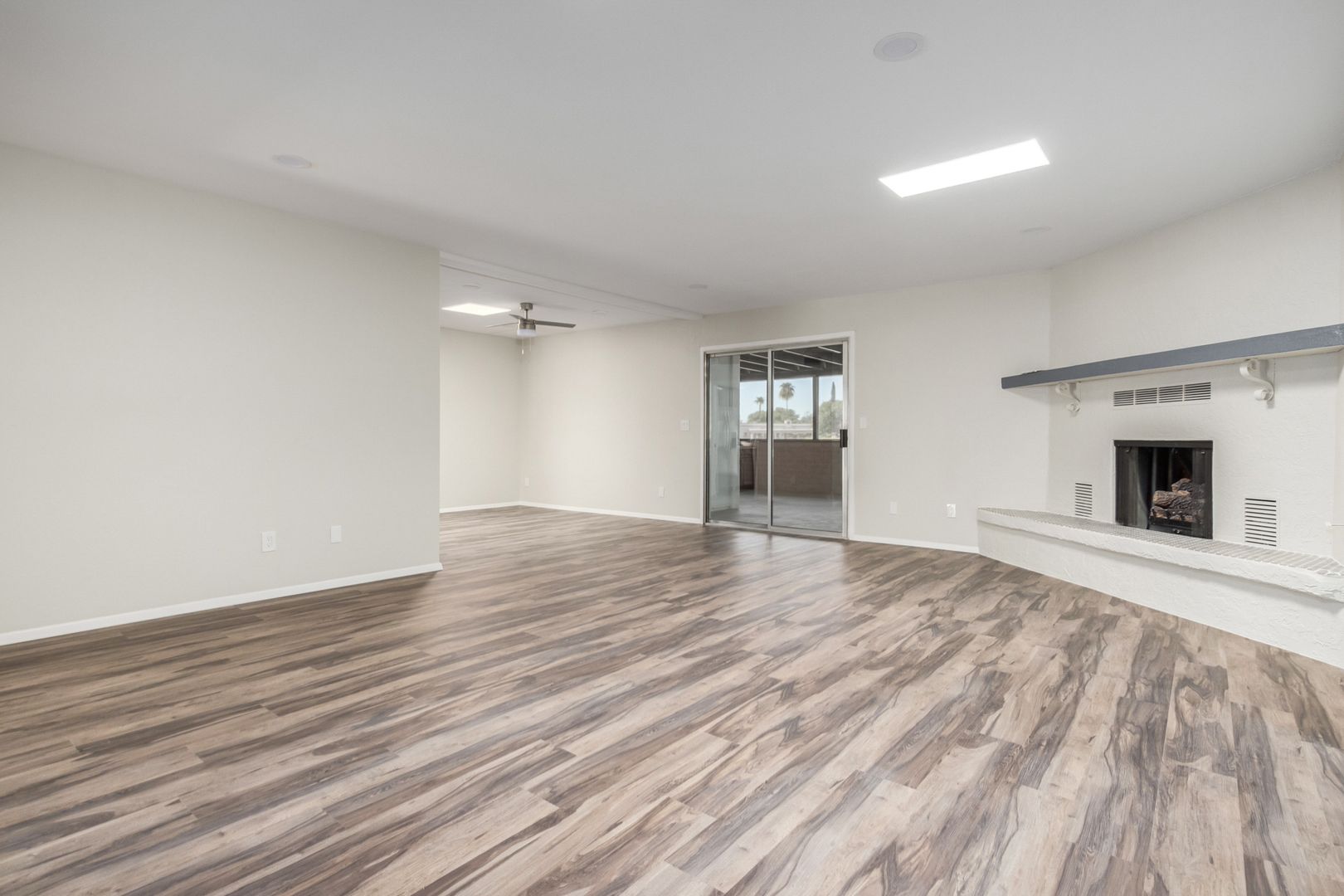 Welcome to this charming 3-bed, 2-bath residence on a serene golf course lot. 55+ Community- You're greeted by a lovely living room w/ skylights for abundant natural light, a soothing palette, attractive tile flooring, and an inviting fireplace for cozy evenings with loved ones. The eat-in kitchen boasts quartz counters, ample cabinetry, recessed lighting, a stylish tile backsplash, a handy pantry, SS appliances, and a peninsula with a breakfast bar for casual dining. You'll also find a sunroom perfect for enjoying the beautiful Arizona weather year-round. The main bedroom offers ample closet space and a private bathroom for added comfort. The well-sized backyard features a covered patio, well-laid pavers, and picturesque golf course view.