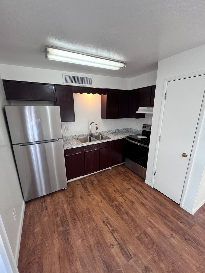 2 Bedroom/ 1 bathroom townhome- Features include: recently renovated single story unit, A/C, no carpet, onsite coin laundry, fenced yard and stainless steel appliances