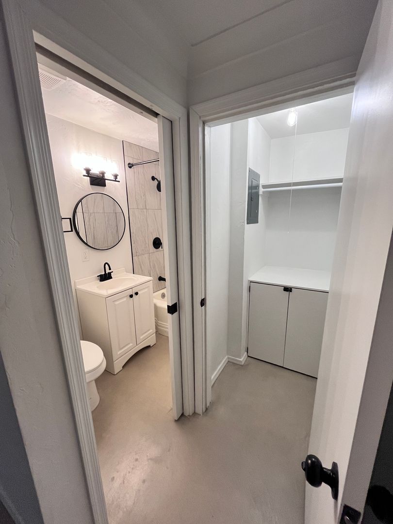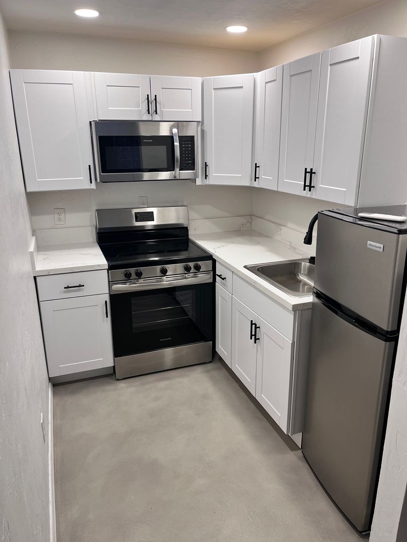Studio/ 1 bathroom charming townhome- Features include: Single story, refrigerator and gas range and A/C. Onsite laundry for convenience. Remodeled with stained concrete floors, new cabinets/ counters, stainless steel appliances and more! MUST SEE!